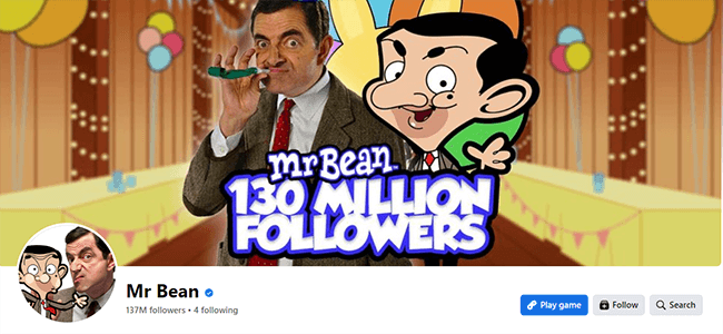 Next, work on the visuals. A professional, eye-catching header and profile image goes a long way. Here’s a good example from Mr. Bean (the fourth most-liked Facebook page in the world):
